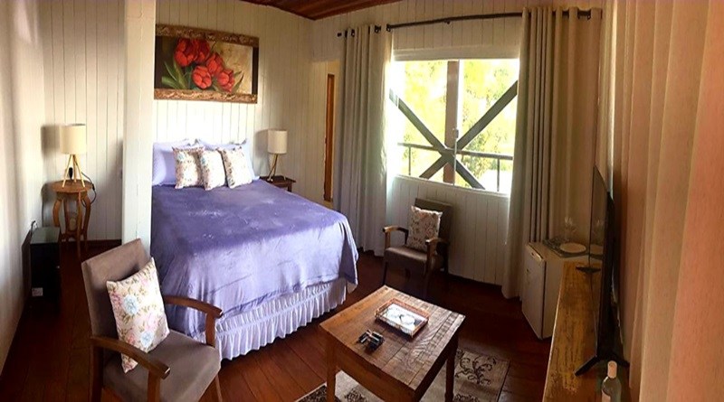 O Chalé da Mata conta com hidromassagem dupla, varanda, tv com canais a cabo e frigobar, além de wi-fi, amenities e secador de cabelos.
