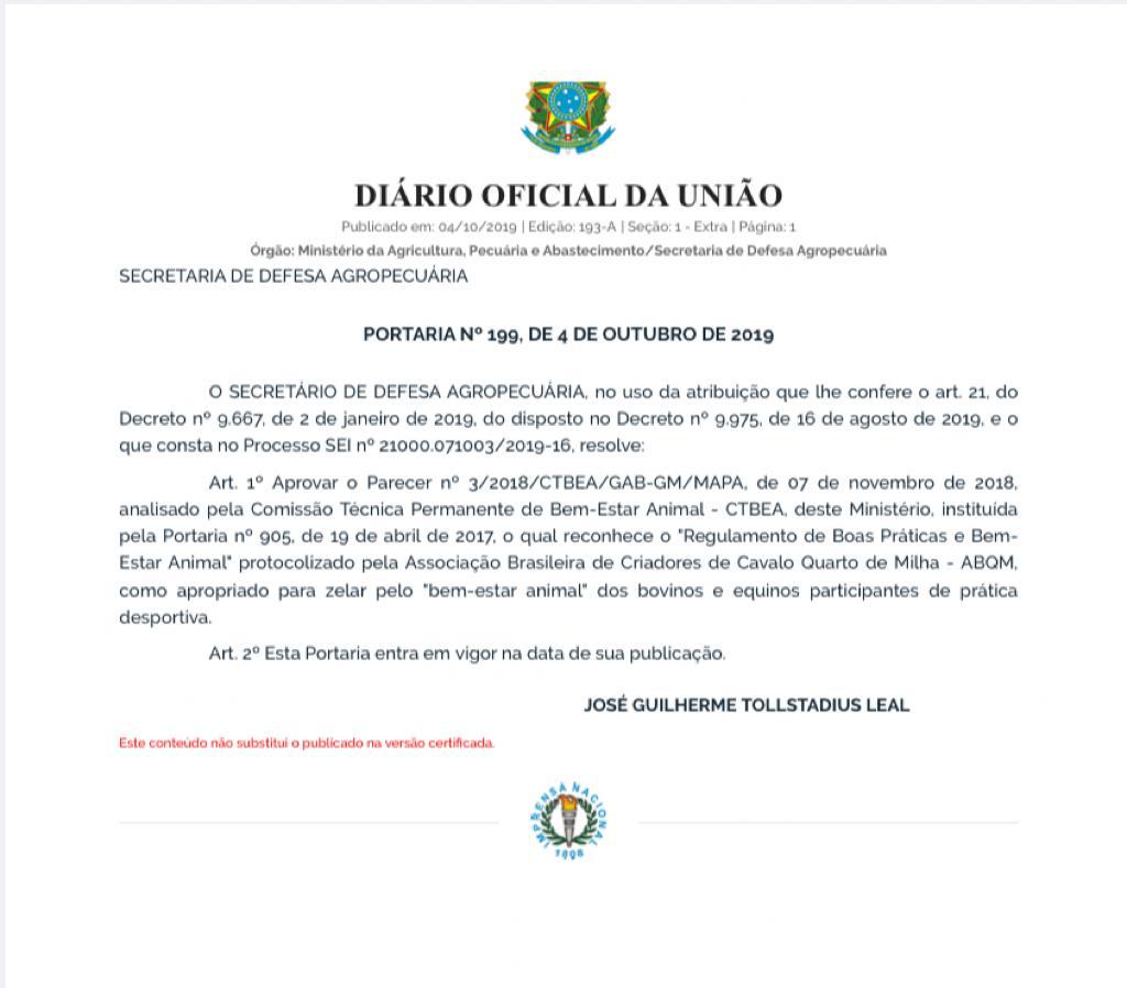 A portaria é decorrente de proposta formulada pela Associação Brasileira de Criadores de Cavalo Quarto de Milha (ABQM), que garante o zelo pelas boas práticas e bem-estar animal dos bovinos e equinos participantes da prática desportiva.