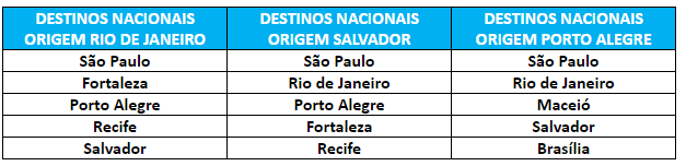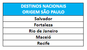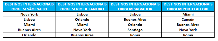 Já para passageiros de origens Rio de Janeiro, Salvador e Porto Alegre, a opção número um foi a própria capital paulista, seja por ser o centro financeiro do país ou pelos atrativos turísticos e de compras, que podem ser combinados com cultura e gastronomia.