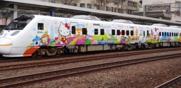 Localizada na ilha asiática, Taiwan acaba de inaugurar um trem completamente decorado com imagens da gatinha com características humanas mais famosa do mundo. São oito vagões do veículo, que tem seu interior inteiro marcados com o rosto da Hello Kitty e tem capacidade para 376 passageiros, o trem temático irá operar entre as cidades de Taipei e Taitung.
