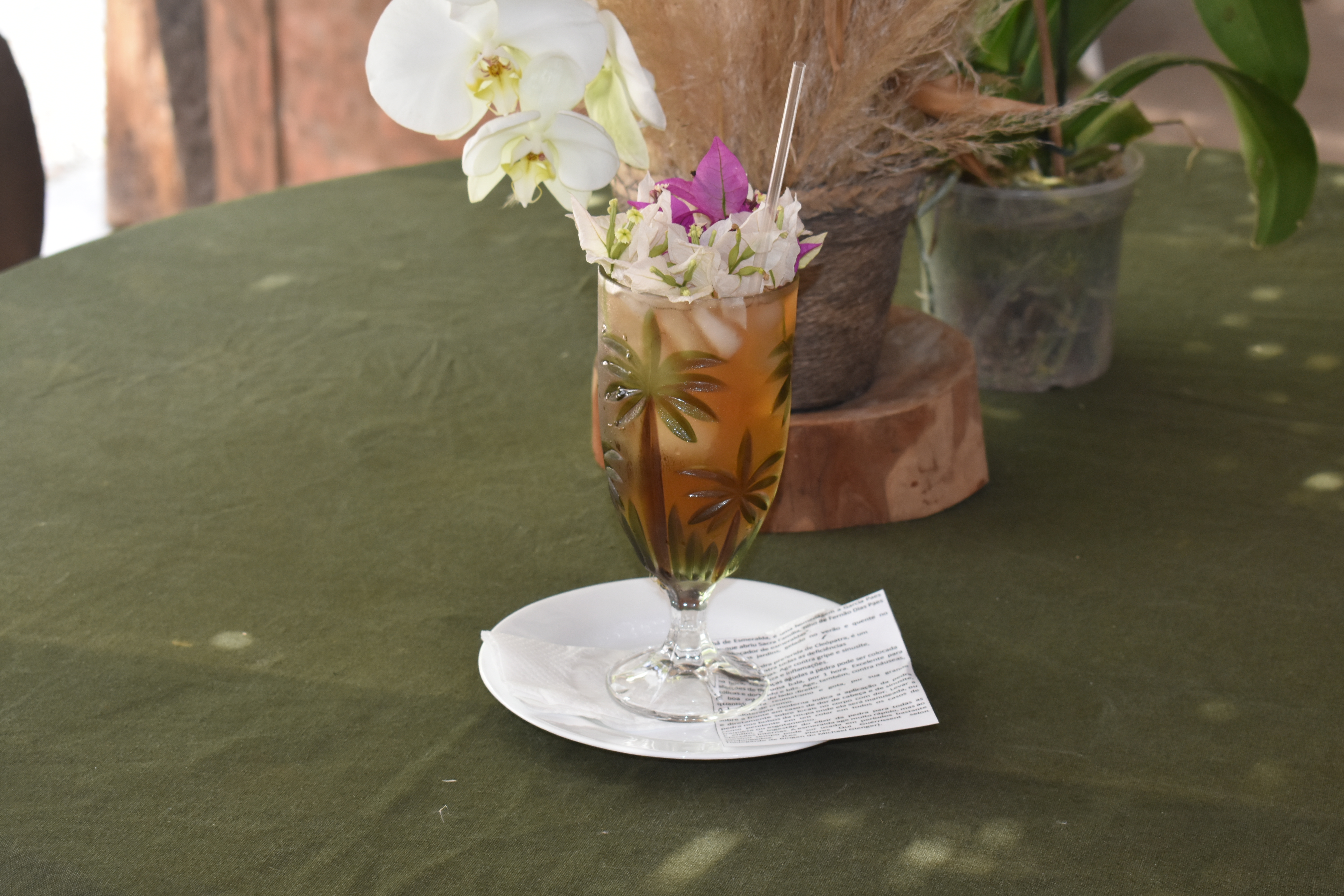 E nossa caminhada se inicia pelos jardins, pois são vários, suas esculturas, redes e seu silêncio interno e externo. Há alguns visitantes que circulam e se maravilham com tanta sofisticação verde. Cada planta, cada passo que dou cada sino que toco enchem meu coração de esperança. São inúmeras fotos e lembranças, pois Cristina é uma parceira. Ao nos despedirmos para o almoço, qual não foi nossa surpresa, ao sermos acalorados, com o chá de esmerala, com plantas comestíveis e de uma beleza única, aonde, cá vá sans dire, encontrei minha esmeralda. Foi um presente de agradecimento por nossa visita, tenho certeza e mais uma demonstração de carinho.