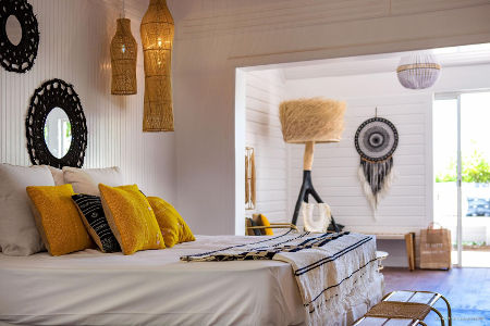 O ambiente interno do Villa Marie Saint-Barth é igualmente apaixonante e sofisticado. A rica decoração foi detalhadamente pensada por Jocelyne Sibuet, proprietária da rede, que viajou mais de 47 mil quilômetros para garimpar objetos que se encaixassem perfeitamente no conceito “tropical chique” do décor. Para isso, ela trouxe peças de oito países, entre Índia, Indonésia, Tunísia, Peru, Marrocos e, claro, França.