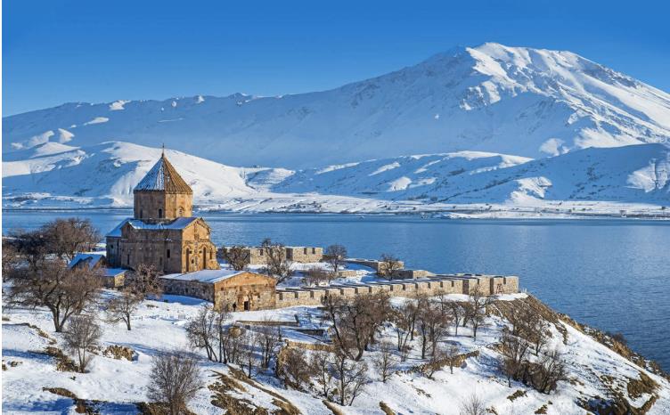Altitude, selvagem e desolado –, tudo na região de Van, no sudeste da Turquia, é extremo: o Lago Van é o maior do país e os vulcões que se erguem sobre as costas norte e oeste são os seus picos mais altos. Com pequenas ilhas que pontilham o lago e antigos castelos, igrejas, mesquitas e túmulos em suas margens –, ou seja, este é realmente um local deslumbrante. O lago é tão salgado que a maior parte dele não congela no inverno, então, mesmo que seja em meados de janeiro, você pode pegar a balsa para a Ilha Akdamar para visitar a Igreja da Santa Cruz, do século 10 – já foi uma igreja real do reino armênio de Vaspurakan.
