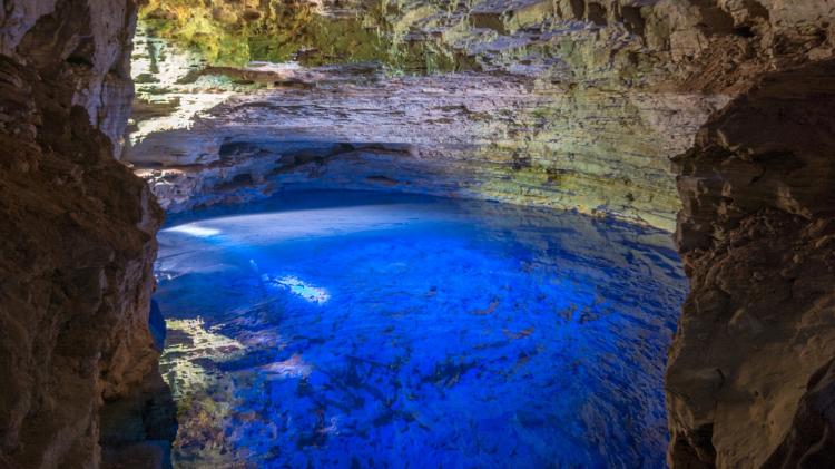 Localizado na Chapada Diamantina, na Bahia, o Poço Encantado surpreende os visitantes com uma água cristalina que exibe uma intensa coloração azul. Esse paraíso brasileiro é cartão postal, mas não é permitido entrar na sua água.
