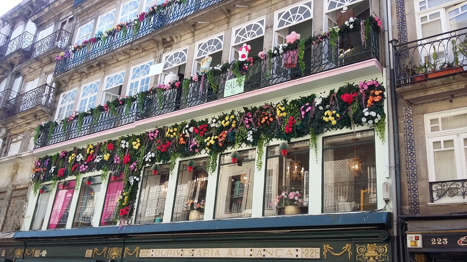 E um dos meus lugares favoritos na Rua das Flores é a Ourivesaria Aliança que foi reaberto recentemente e é um lugar muito bonito. Na fachada você já se encanta com a decoração de flores artificiais e ao entrar na casa que é dividida por dois andares você vai se sentir em uma casinha de boneca ou um castelo de princesa. No primeiro andar uma casa de chá é oferecida para os clientes, já no segundo piso um salão conservado com muitos detalhes antigos oferece durante as noites de quintas-feiras o jantar com fado que para quem gosta não pode perder, por apenas 30 € esta incluso o couvert, entradas, prato principal (que geralmente são pratos típicos português), sobremesa, café e vinho do Douro já se gosta de Jazz também tem todos os sábados a partir das 21h e por apenas 10 € assiste algo diferente e ganha coktail de vinho do porto.