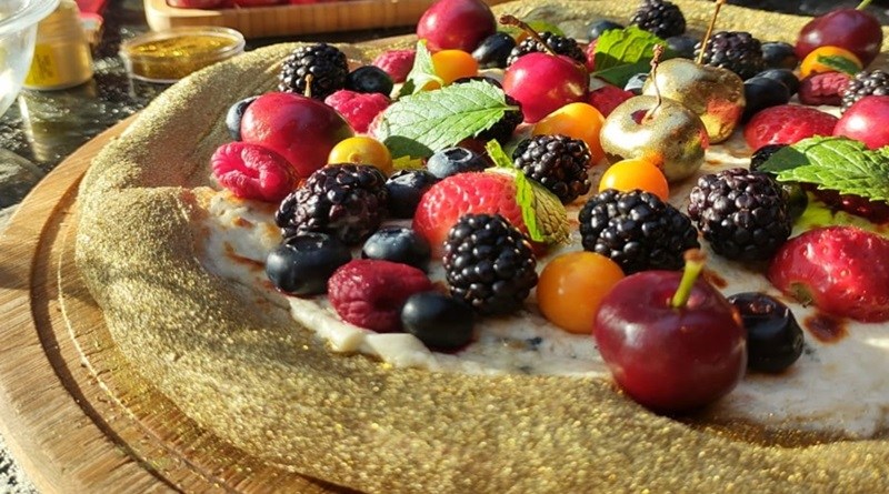 Pré-asse a pizza. Pegue uma massa napolitana de 350g e abra no formato redondo de 35 cm preservando uma borda um pouco maior. Cubra a massa com mascarpone usando uma espátula de silicone mole para distribuir todo o recheio. Salpique pedaços de gorgonzola azul em toda a pizza e leve ao forno para assar até a borda ficar bem corada. Distribua aleatoriamente sobre a pizza assada os morangos cortados ao meio, amoras, framboesas, cerejas, mirtilos e physalis e finalize com folhas de hortelã. Para pintar a borda dilua 5g de pó para decoração dourado metálico comestível em 15g de álcool de cereais. Use um pincel de cerdas moles para aplicar sobre a borda a tinta dourada. Após aplicar sobre toda a base use um pincel seco para aplicar o glitter comestível dourado.