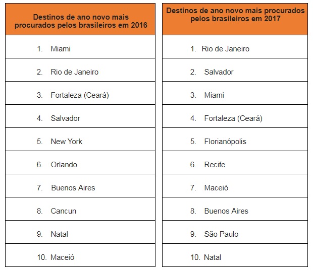Os brasileiros já estão começando a programar suas viagens de ano novo. O Kayak preparou um levantamento com os dez destinos de réveillon mais procurados pelos turistas brasileiros em 2016 e 2017, para entender como estão suas preferências para o período e se houve diferenças significativas em relação ao ano passado. Um dos destaques desse ano é o aumento de procura por destinos nacionais.