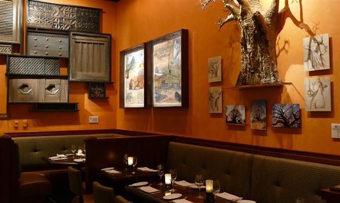 Desde meados de maio, funciona no parque o restaurante Tiffins, a estreia do Animal Kingdom na alta gastronomia. Na entrada, em meio às decorações que remetem a expedições, uma placa descreve o local: “uma galeria de arte baseada nas viagens e aventuras que inspiraram a criação do Disney’s Animal Kingdom”. E é exatamente isso que se vê pelos salões.