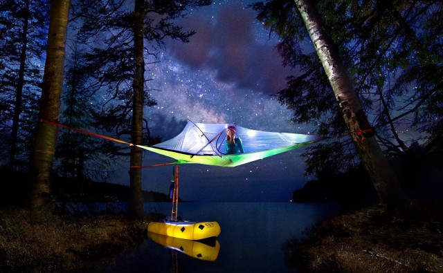 Uma empresa baseada em Londres desenvolveu uma barraca de acampamento que fica suspensa como uma rede. A barraca exige um pouco mais de esforço para ser montada do que o necessário para armar uma barraca comum: esse modelo precisa ser pendurado em três lugares diferentes, e distantes um do outro de maneira que formem um triângulo. O resto é basicão: há um forro que protege contra insetos, capa de chuva, hastes maleáveis para sustentar o espaço interno.