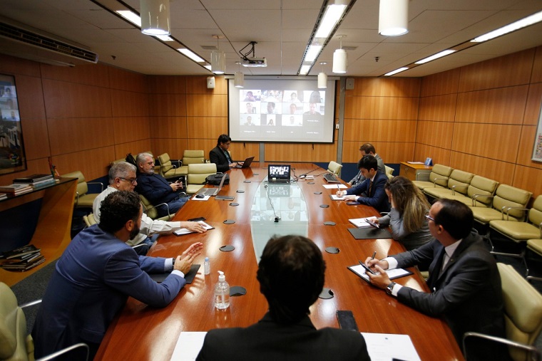 Ministro Marcelo Álvaro e equipe do MTur em videoconferência com representantes da Caixa e BNDES. Crédito: Dênio Simões/MTur