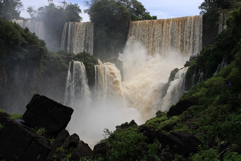 A força da paisagem se destaca num panorama de penhascos escarpados com 275 quedas de um portentoso volume de água que desabam de uma altura média de 70 metros e seguem por 2,7 quilômetros ao longo de um caudaloso rio. Enfeitiçado pela cena, só agora percebemos as cores deste cenário reduzidas às diversas graduações de um café com leite, além do azul que às vezes surge no céu entre a névoa formada pelo chuvisco das aguas.
