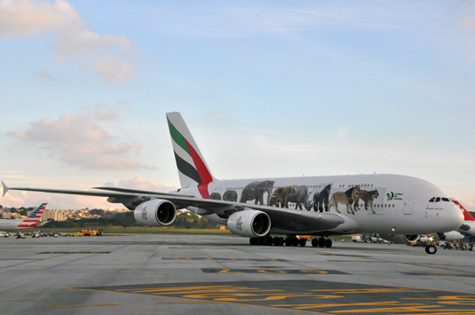 A operação marca os dez anos da Emirates no Brasil, que voou pela primeira vez para o país em outubro de 2007. O A380 conta com um total de 491 assentos, sendo 401 na econômica, 76 na executiva e 14 suítes na primeira classe. A aeronave conta com dois shower spas – disponíveis para os passageiros da primeira classe; e um lounge com canapés e bebidas para quem está na executiva e primeira classe. Outro diferencial do A380 é o entretenimento, com mais de 2,6 mil canais disponíveis.