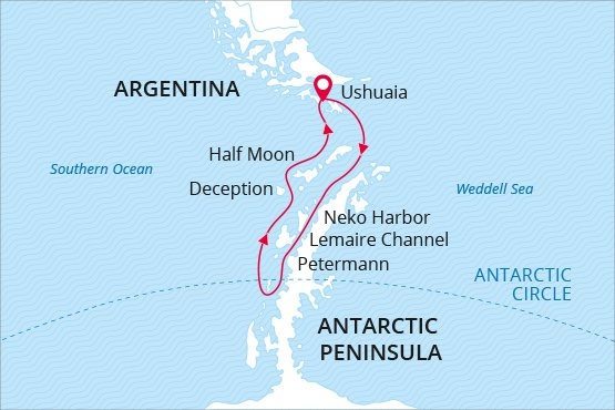 São 14 dias de viagem que começam em Ushuaia, segue para a Passagem Drake e permanece durante quatro dias nas Ilhas Shetland do Sul e na Península Antártica. Na volta, novamente a Passagem Drake e desembarque em Ushuaia.