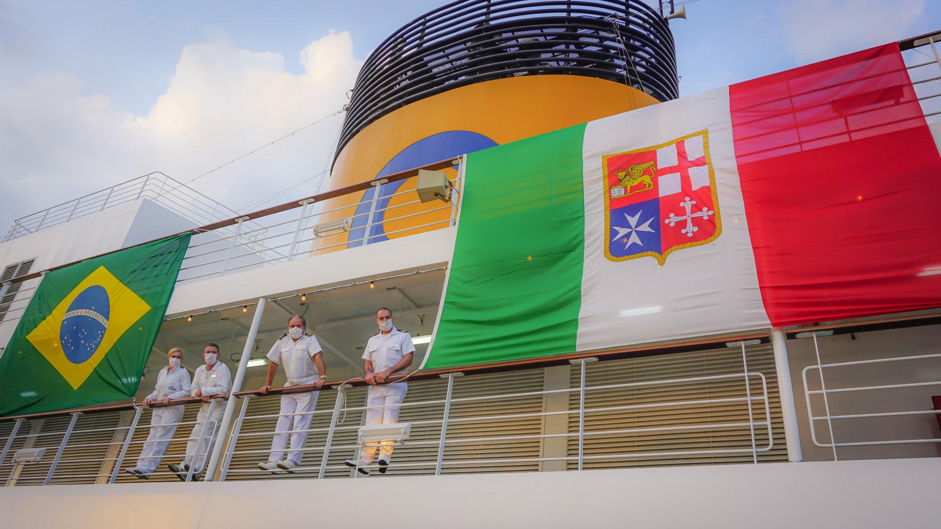 As bandeiras da Itália e do Brasil também foram erguidas no navio como símbolo da parceria da Costa, uma empresa genuinamente italiana, com o Brasil. A Costa Cruzeiros navega na América do Sul há 72 anos ininterruptos.