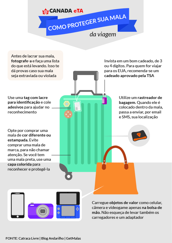 Se você for leigo no assunto, confira neste infográfico super legal do ETA Canada Visa, algumas dicas de como você deve proteger sua mala de viagem.