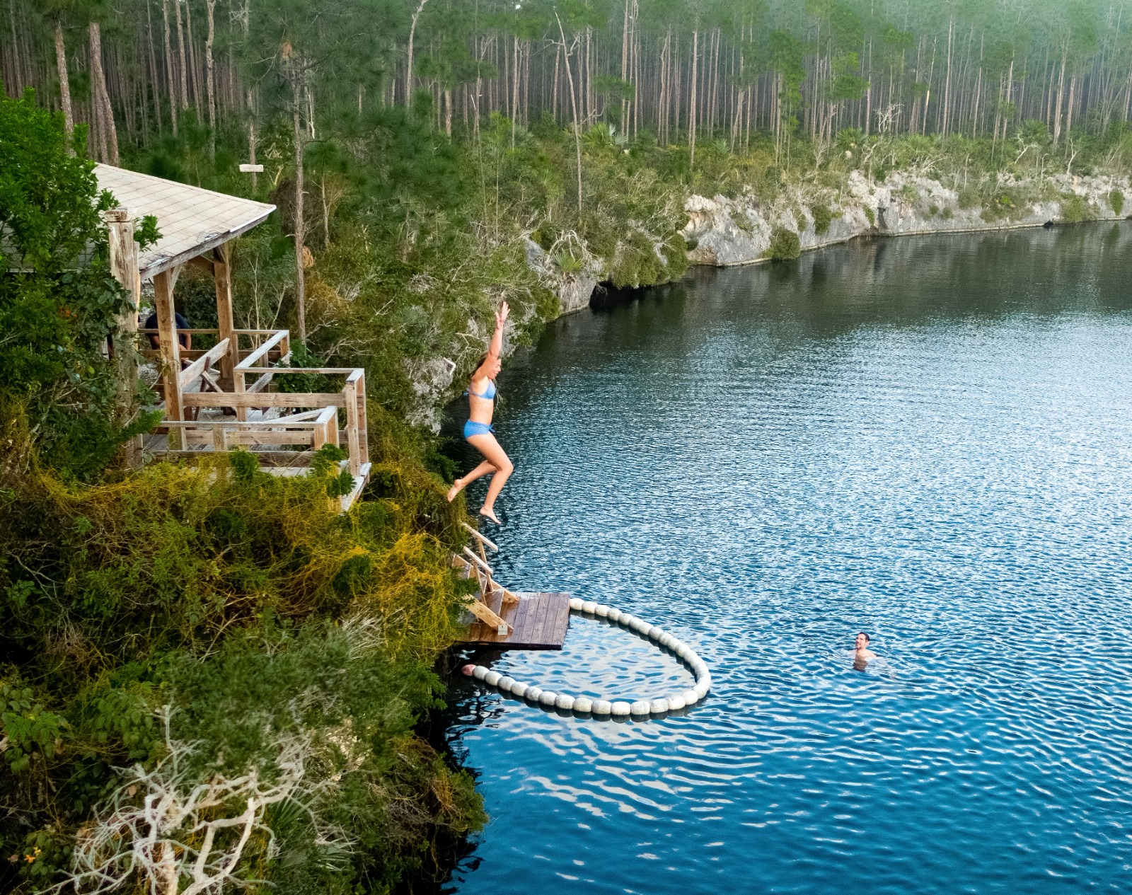 Ao longo do arquipélago, mergulhadores se aventuram em um mundo de maravilhas nas águas das Out Islands. Há um leque de opções, desde nadar com golfinhos em Bimini até explorar os misteriosos buracos azuis de Andros. As águas cristalinas abrigam recifes de coral, robustos tarpões e cardumes de fauna marinha exótica.