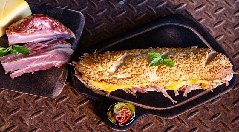 London Pork – servido na baguete com copa lombo, patê de cream cheese, mostarda, mel e queijo prato com ervas, alface, rúcula, cebola, tomate e tomate cereja , da London cafeteria – ASTUR – VGCOM