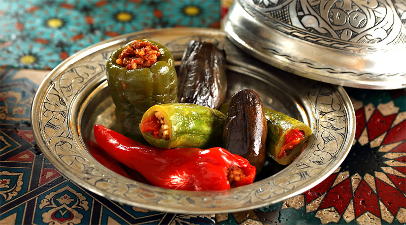 Já o de carne é considerado um prato principal, e tem como acompanhamento o molho de iogurte. Qualquer vegetal que possa ser preenchido ou envolvido em torno dessas misturas pode ser usado como um Dolma, o que inclui: abobrinha, berinjela, tomate, repolho e folhas de uva. No entanto, o pimentão verde com o recheio de arroz é o “rei” dos Dolmas. Um banquete turco real para os olhos e ao paladar.