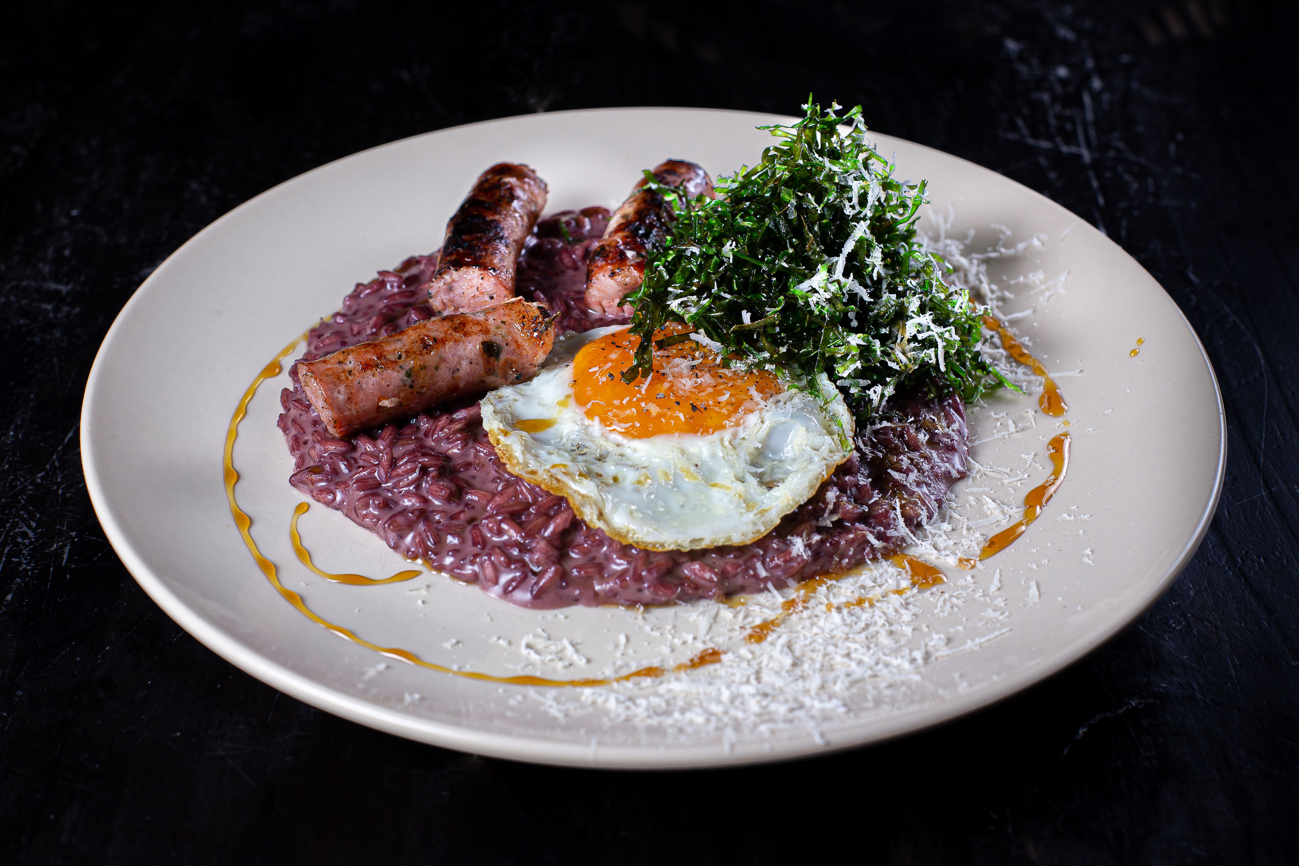 – Monte no prato colocando o risoto por baixo, coroando com o ovo, as linguiças e a couve. Finalize com a couve, o queijo e um fio grosso do melaço de cana.